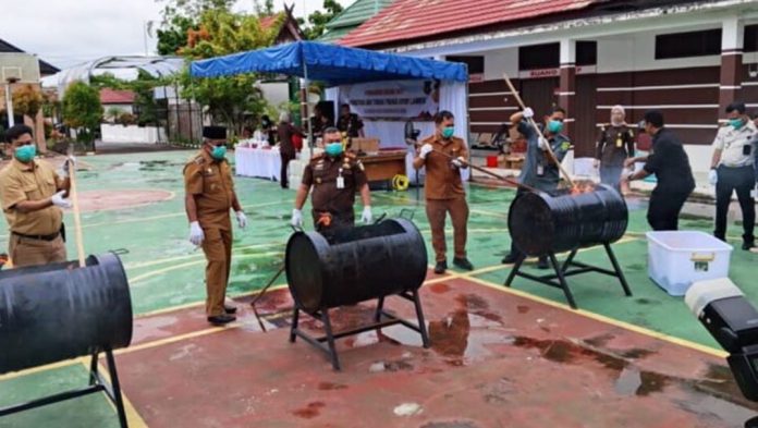 Pemusnahan Barbuk yang berlangsung pekan lalu di kantor Kejaksaan Negeri (Kejari) Kabupaten Kobar itu, disaksikan langsung unsur Forum Komunikasi Pimpinan Daerah (Forkopimda) Kabupaten Kobar, di antaranya Bupati dan Wakil Bupati Kobar, Kapolres, Dandim Pangkalan Bun, Ketua Pengadilan Negeri Pangkalanbun, perwakilan Lapas serta Dinas Kesehatan.