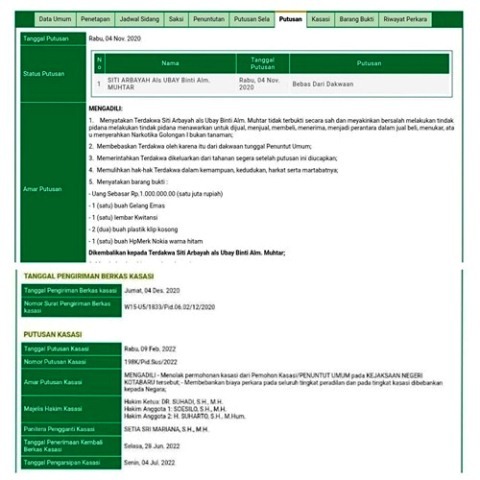 Sementara itu, perkara kedua dengan nomor 149/Pid.Sus/2020/PN Ktb menjerat Siti Arbayah alias Ubay. Ia sempat dituntut 8 tahun 6 bulan penjara oleh Jaksa Penuntut Umum dengan barang bukti sabu 4 bungkus kecil beserta perlengkapannya.