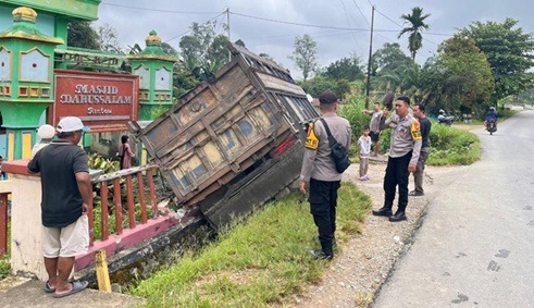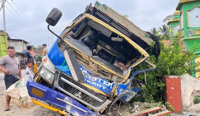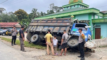 Akibat kondisi tersebut, pengemudi kehilangan kendali atas kendaraan yang dikemudikannya. Truk kemudian keluar dari badan jalan dan menghantam tembok Masjid Darussalam Rintau yang berada di sisi jalan.