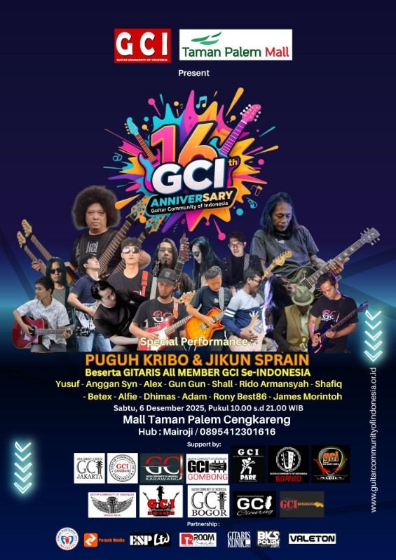 Jakarta | Lapan6Online : Guitar Community of Indonesia (GCI), wadah utama bagi para pecinta dan pemain gitar di seluruh Indonesia, yang berdiri pada tanggal 10 November 2009 dengan bangga mengumumkan perayaan ulang tahun ke-16 mereka yang akan diselenggarakan pada hari Sabtu, 6 Desember 2025.