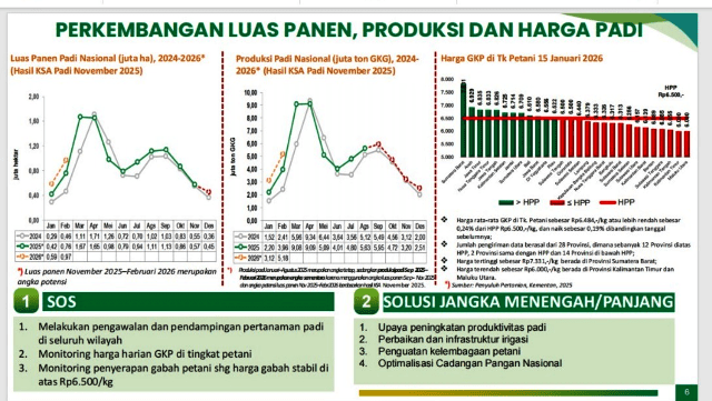 Untuk menjaga stabilitas produksi dan harga gabah, Kementan menekankan langkah sosialisasi dan pengawasan (SOS), antara lain pengawalan dan pendampingan pertanaman padi di seluruh wilayah, monitoring harga harian GKP di tingkat petani, serta pengawasan penyerapan gabah petani agar harga tetap stabil di atas Rp6.500 per kilogram.