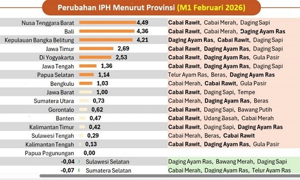 Nusa Tenggara Barat mencatat kenaikan IPH tertinggi mencapai 4,49 persen, dengan komoditas penyumbang utama terdiri dari cabai rawit, cabai merah dan daging sapi. Posisi kedua ditempati Bali dengan kenaikan 4,36 persen yang dipicu cabai rawit, cabai merah dan daging ayam ras.