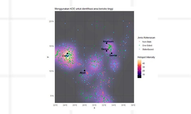 Distribusi spasial dengan KDE mengungkapkan bahwa kekerasan terkonsentrasi pada hotspot strategis, terutama di Darfur dan Khartoum, menegaskan bahwa dampak tragedi kemanusiaan tidak merata dan sangat bergantung pada lokasi dan konteks politik.