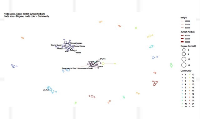 Gambar jaringan diatas memperlihatkan konflik di Sudan dengan node sebagai aktor dan edge sebagai konflik. Ukuran node mengintrepetasikan tingkat keterhubungan (degree), warna menunjukkan komunitas, dan ketebalan edge menunjukkan jumlah korban. Pemerintah Sudan, SPLM/A, dan Civilians terlihat sebagai aktor paling sentral, sementara beberapa komunitas besar menandai kelompok aktor yang saling terkait erat.