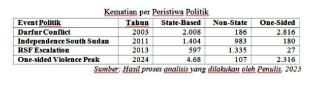 Dapat dilihat pada tabel di atas bahwa jumlah kematian terkait peristiwa politik di Sudan menunjukkan pola yang berbeda-beda tergantung tipe kekerasan. Pada Darfur Conflict (2003), One-Sided Violence mendominasi korban dengan 2.816 kematian, diikuti oleh State-Based Violence sebanyak 2.008 korban, sementara Non-State Violence relatif rendah. Saat Independence South Sudan (2011), State-Based Violence masih tinggi dengan 1.404 korban, sedangkan Non-State Violence meningkat menjadi 983 korban, menunjukkan keterlibatan aktor non-negara dalam konflik yang terkait perubahan politik. RSF Escalation (2013) menandai puncak Non-State Violence dengan 1.335 korban, sementara One-Sided Violence turun drastis. Adapun pada One-sided Violence Peak (2024), terjadi lonjakan besar pada State-Based Violence (4.680 korban) dan One-Sided Violence (2.316 korban), menegaskan eskalasi konflik yang menargetkan populasi sipil sekaligus kekerasan oleh aktor negara.