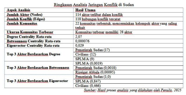 Dapat dilihat pada tabel diatas yang didapatkan dari analisis jaringan konflik di Sudan bahwa terdapat 114 aktor yang terlibat dalam 118 konflik, membentuk 22 komunitas dengan ukuran bervariasi, di mana komunitas terbesar terdiri dari 28 aktor.