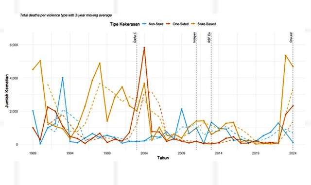 Garis vertikal putus-putus menandai peristiwa politik penting seperti Darfur Conflict (2003), kemerdekaan South Sudan (2011), eskalasi RSF (2013), dan puncak One-Sided Violence (2024). Label pada garis vertikal menekankan bahwa banyak lonjakan kematian bertepatan dengan momen-momen kritis ini, menunjukkan korelasi antara eskalasi politik dan peningkatan angka kematian.