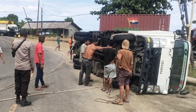 “Mobil terjatuh ke samping bahu jalan dan terseret beberapa meter sebelum akhirnya menabrak tiang listrik,” ungkap AIPDA Amrullah.