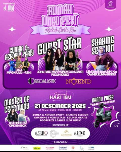 Kegiatan ini tidak terlepas dari dukungan luar biasa dari berbagai pihak. Sponsor utama yang telah memberikan dukungan adalah eL STUDIO eL CREATIVE, eL DIALEKTIS, dan eL RECORD, yang berperan penting dalam menjadikan Rumah Ungu Fest 2025 berjalan sukses dan penuh kesan. (*Mai/BM/Lpn6)