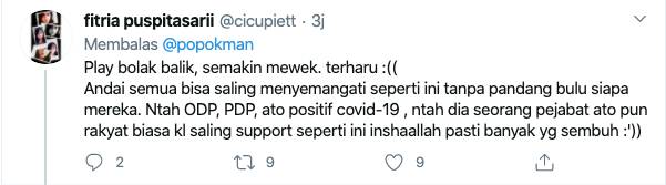 Warganet yang melihat aksi inipun menuliskan berbagai komentarnya atas reaksi positif warga untuk pasien Covid-19, sehingga cuitan yang diunggah oleh @black__valley1 kini sudah di retweet ribuan kali dan disukai lebih dari delapan ribu pengguna twitter.