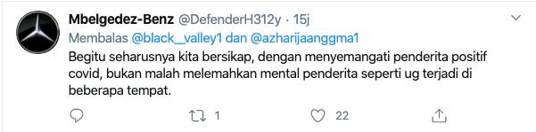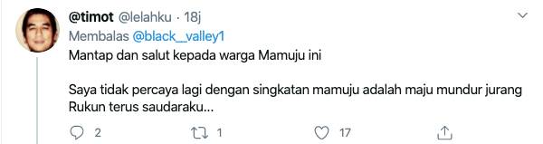“Salut saya dengan kebersamaan Warga Mamuju, Pasien positif COVID diberikan semangat & dukungan untuk sembuh dan Tidak di kucilkan,” tulisnya dalam cuitannya tersebut.