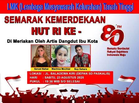 Diakhir keterangannya, Herwanto Nurmansyah menyatakan bahwa,”Peringingatan Agustusan ke-80 Kelurahan Tanah Tinggi ini diharapkan dapat menjadi momentum untuk meningkatkan kesadaran dan semangat kebangsaan, serta memperkuat persatuan dan kesatuan bangsa Indonesia untuk mencapai tujuan bersama,” pungkas Advokat Artis yang sekaligus pemain Film Kolosal ini penuh semangat. (*Deriyanto/Alferdi/Yoyon)