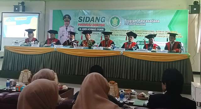 Bupati Majene, H. A. Achmad Syukri, SE., MM., resmi menjalani sidang promosi doktor pada Program Pascasarjana Sekolah Tinggi Ilmu Ekonomi (STIE) AMKOP Makassar, Rabu (14/5/2025)/Foto2 : Ist.