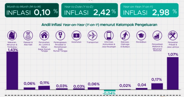 “Kontributor utama inflasi berasal dari kelompok makanan, minuman dan tembakau dengan laju 4,73 persen. Sementara kelompok informasi, komunikasi dan jasa keuangan justru mengalami deflasi sebesar 0,58 persen,”