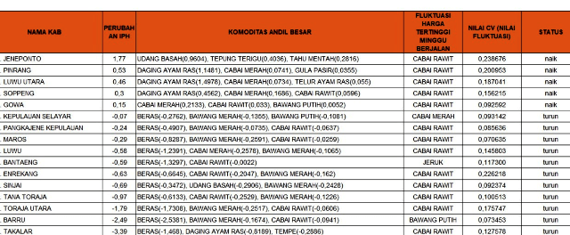 Data menunjukkan cabai rawit menjadi komoditas paling berfluktuasi di hampir seluruh daerah Sulawesi Selatan, dengan nilai koefisien variasi (CV) tertinggi mencapai 0,23 di Jeneponto. Beberapa daerah lainnya juga mencatat fluktuasi tinggi pada cabai rawit seperti Enrekang (CV 0,22) dan Luwu Utara (CV 0,19).